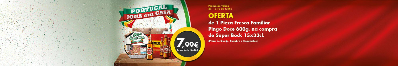 Promoção Pingo Doce de 1 a 12 de Junho oferta de uma pizza na compra de Super Bock.